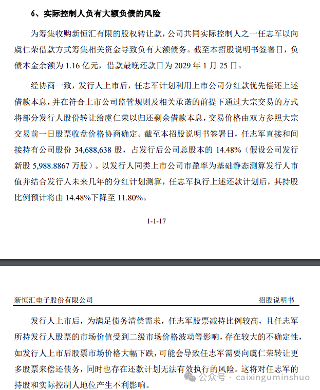 第二个雷,实控人债务高悬。 这才是今天稿子的重头戏。二号实控人任志军,为了收购股权,背上了1.16亿的债务,债主正是大股东虞仁荣。借钱买股份,这操作在资本市场不算新鲜,但新恒汇这事儿,微妙就微妙在还款计划上。