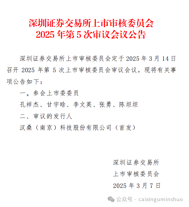 深圳证券交易所上市审核委员会定于 2025 年 3 月 14 日 召开 2025 年第 5 次上市审核委员会审议会议。现将有关事 项公告如下: 一、参会上市委委员 孔祥杰、甘宇晗、李文英、张勇、陈坦坦 二、审议的发行人 汉桑(南京)科技股份有限公司(首发) 深圳证券交易所 上市审核委员会.拟在创业板上市的音频设备制造商——汉桑科技。这家公司想干啥呢?招股书上写得明明白白,要募资 10.019亿元。这笔钱听着不少,准备投向三个地方:一是 年产高端音频产品150万台套项目,二是 智慧音频物联网产品智能制造项目,三是 智慧音频及AIoT新技术和新产品平台研发项目。当然,还有惯例的 补充流动资金。