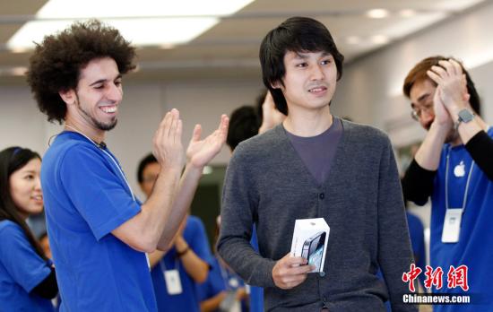10月14日, iPhone 4S在全美各大苹果零售店以及澳大利亚、加拿大、法国、德国、日本和英国正式上市。图为日本东京苹果专卖店,店员为iPhone 4S手机的第一个购买者鼓掌。 中新网11月2日电...